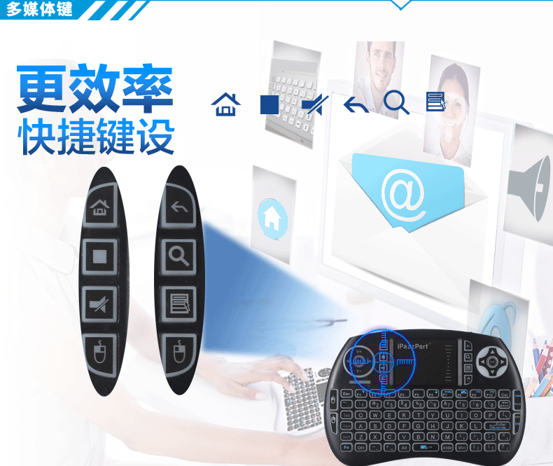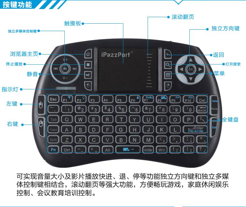 - 实现家庭影院(XBMC媒体中心)无线远程控制,在沙发上轻松输入文本/上网/玩游戏而无需多个遥控器,让生活更轻松愉快
