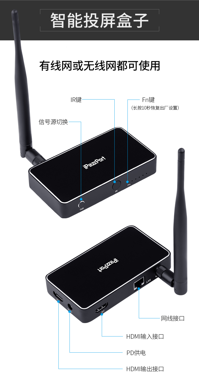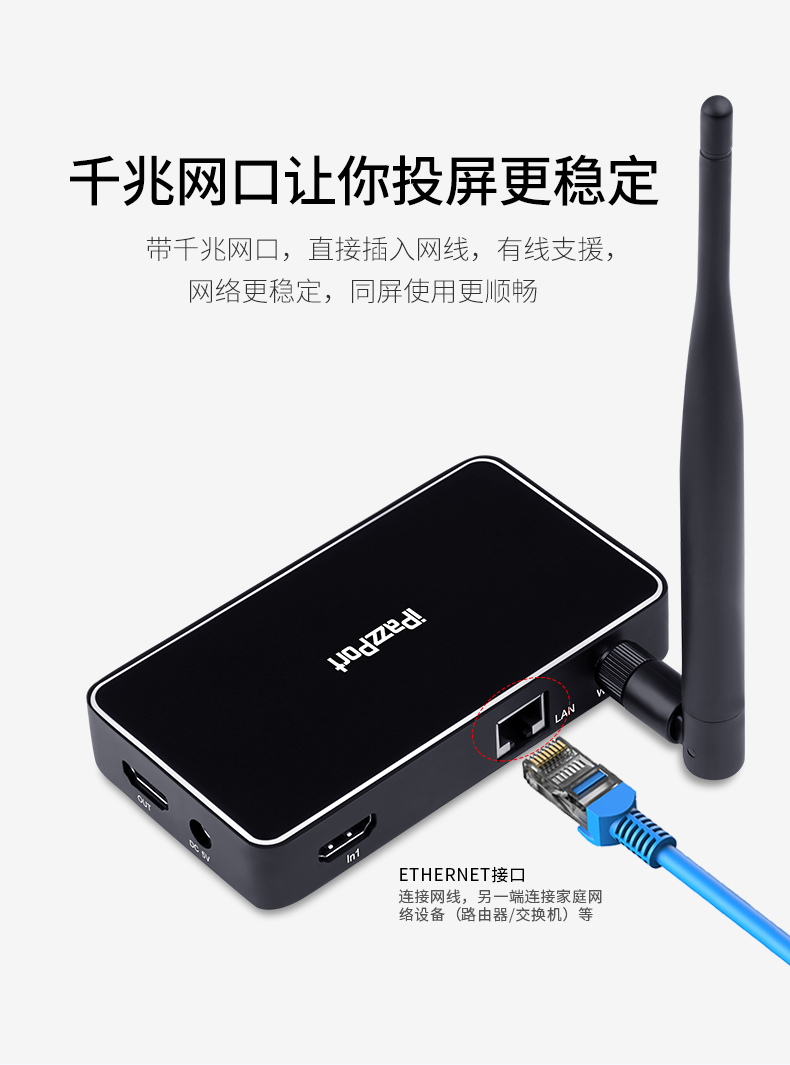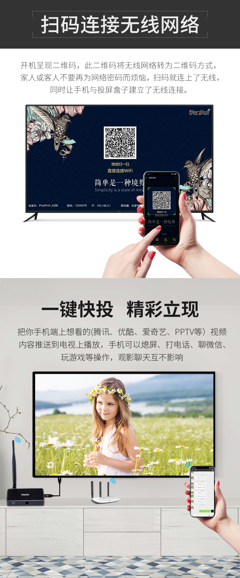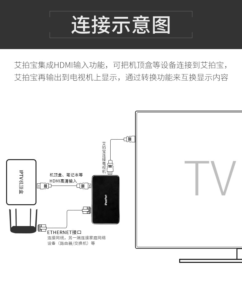 9)HDMI投射和机顶盒之间的自由切换:将机顶盒与此ipazzportcast连接,然后与电视连接,然后您可以通过遥控器(可选项),或者按压投屏器上的切换按钮进行信号源的转换。